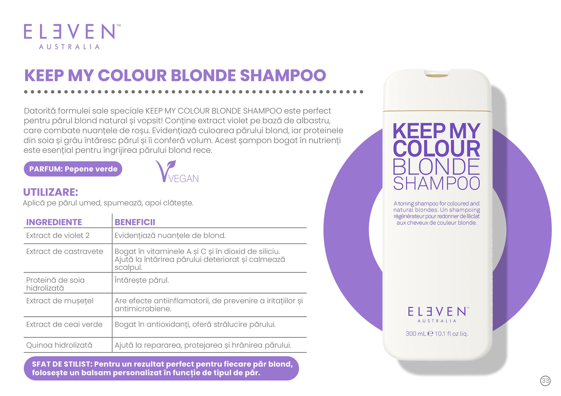Sfaturi: După utilizare, aplică întotdeauna masca de tratament KEEP MY COLOUR, care închide structura părului, oferind îngrijire profundă și făcând culoarea blondă mai durabilă. Acest tratament de 200 ml este esențial pentru un păr blond strălucitor.